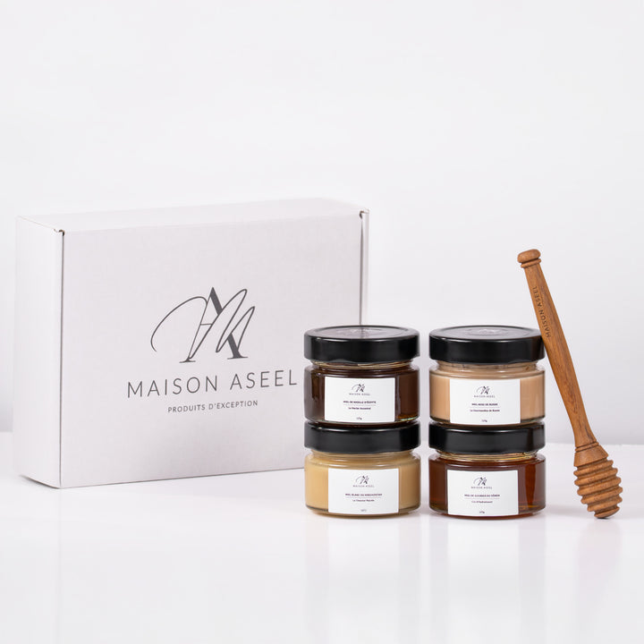 Et si le tour du monde se résumait à une bouchée? Maison Aseel vous présente son coffret signature, réunissant nos miels les plus précieux et savoureux. Le miel blanc du Kirghizistan, le miel de jujubier du Yémen, le miel rose de Russie et le miel de nigelle d'Égypte s'unissent pour faire voyager vos papilles. Le tout accompagné d'une cuillère à miel, d'une boîte et d'un sac cadeau. C'est un joli cadeau à offrir, une attention qui va droit au coeur. Parce que prendre soin des autres est la plus belle preuve d'amour.