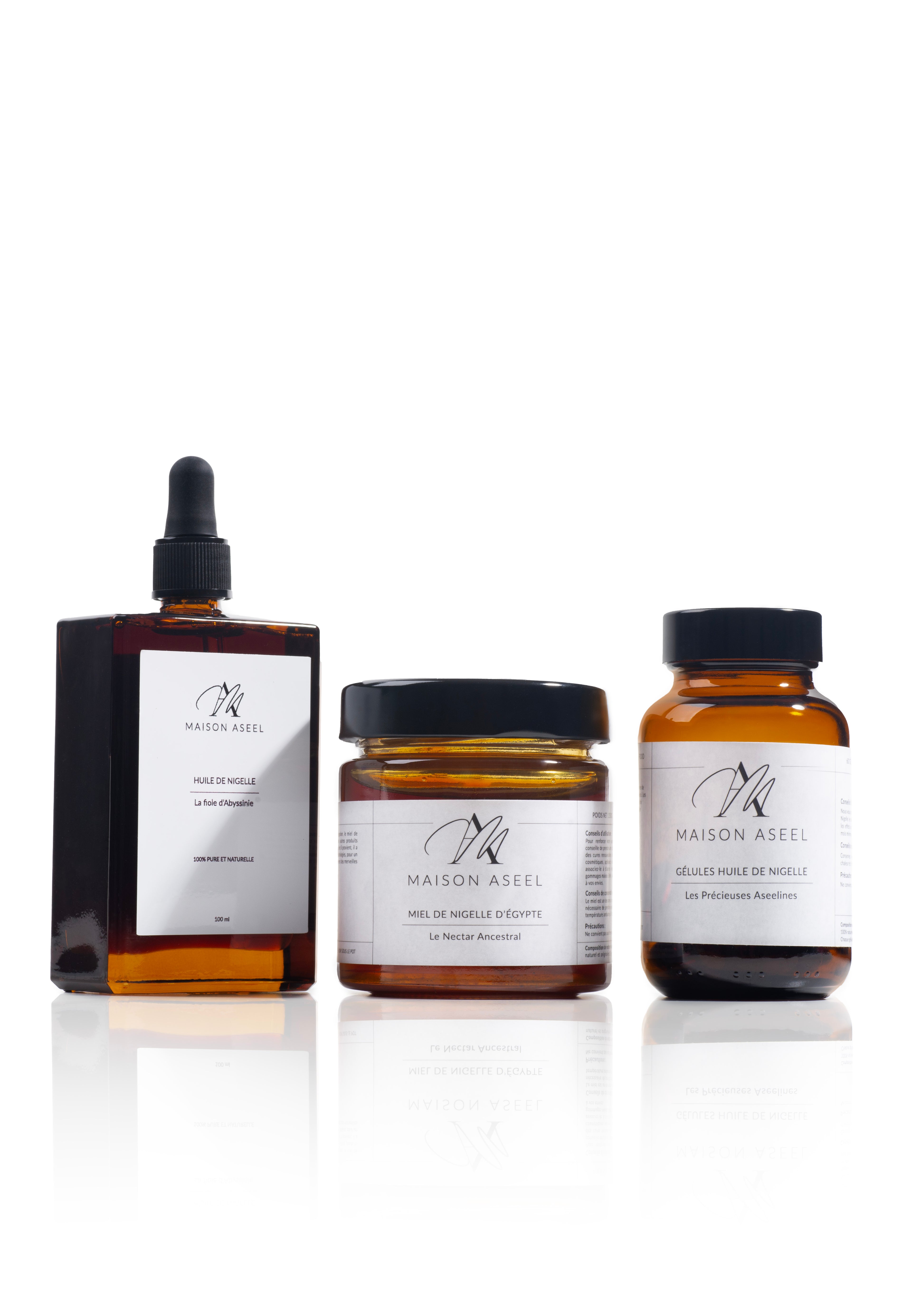 Maison Aseel vous présente son coffret nigelle. Un coffret distingué contenant du miel de Nigelle d' Égypte, de l’huile de nigelle d’Éthiopie et des gélules d’huile de nigelle d’Éthiopie. C’est un sublime coffret à offrir pendant les fêtes, une façon de dire à votre entourage que vous les aimez et que prendre soin de son bien-être n’a pas de prix.