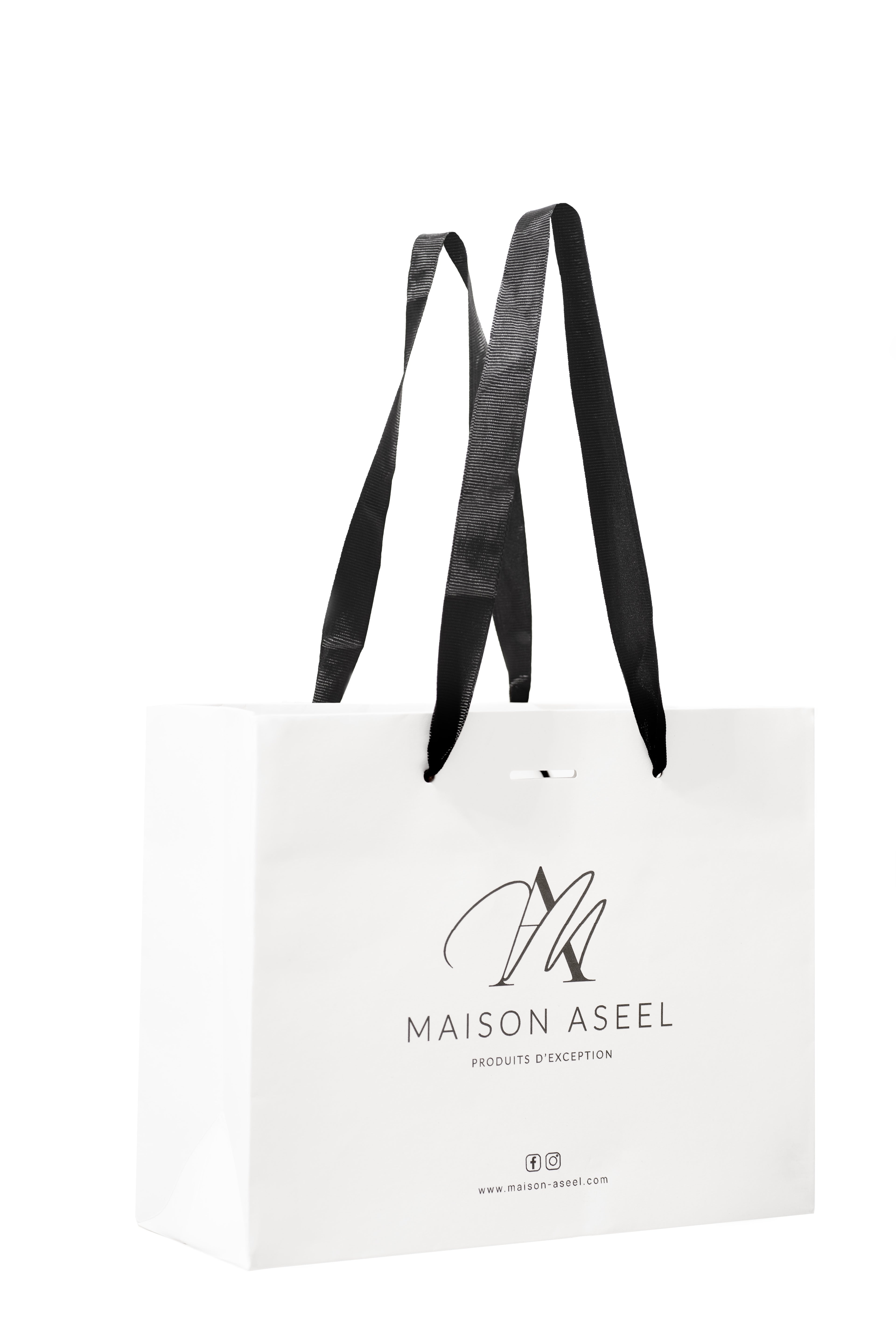 Sublimez vos attentions avec notre sac cadeau Maison Aseel. À la fois sobre et distingué, sa couleur noire et blanche lui permet de s’accorder à toutes les saisons. Il vous accompagne dans vos moments de joie, une passerelle entre vous et le sourire que vous procurerez à l’un de vos proches.